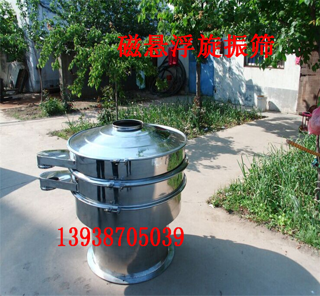 磁懸浮旋振篩;操作簡單,清洗消毒方便,外觀美,噪音小,體積輕,移動方便,出口可以隨意調整,粗細料自動排除,篩分效率高,精度高,任何粉,粒,粘液類,都可以使用,里面有電磁振動塊,也叫倉壁激振器,通過電磁振動塊在振動篩網讓篩網上黏性物料讓物料直接篩出來。